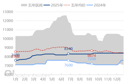 中國酯基生物柴油市場價格代表了國內(nèi)生物柴油產(chǎn)品的價格水平,是國內(nèi)現(xiàn)貨價格關(guān)注的價格指標。2025年中國酯基生物柴油價格波動感收窄,成本面和需求面交替影響價格波動。